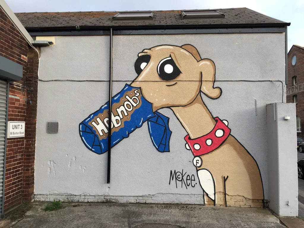 Pete McKee's - Frank the Dog hanging out next door to Russells Bicycle Shed Neepsend store.